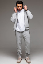 Мужской костюм толстовка + брюки. Толстовка застегивается на молнию, на полочке карманы на молнии, рукава и низ отделаны манжетами, украшена печатью. Брюки с карманами на молнии, внизу манжеты
