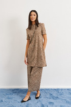 Костюм женский джемпер и брюки из трикотажа. Брюки женские прямого силуэта, пояс на резинке.Боковые карманы на молниях.По низу брюк обработаны разрезы на молниях.Джемпер прямого кроя с дизайнерской печатью"булавки", полочка с накладным карманом.Джемпер с притачными рукавами и манжетами.