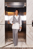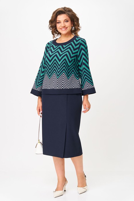 Стильный и гармоничный костюм состоит из блузки и юбки. Геометрический принт блузки притягивать к себе взгляд. Блузка прямого силуэта с нагрудными вытачками и декоративной отделкой по горловине, низу изделия и низу рукава. Рукав втачной одношовный. Спинка без особенностей. Юбка прямого силуэта со шлицей спереди по левой части. Пояс притачной с эластичной тесьмой по спинке, что обеспечивает максимально комфортную посадку на любой тип фигуры.