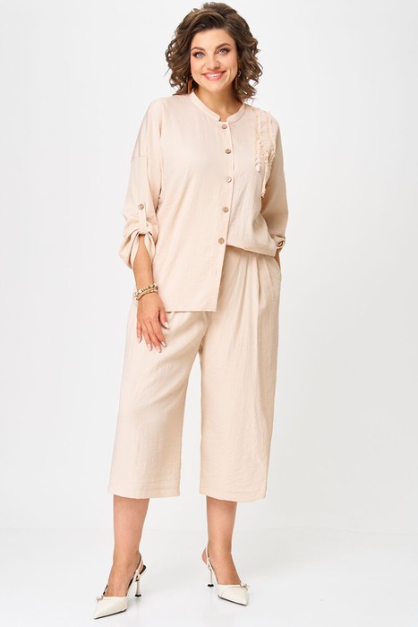 Элегантный костюм  из легкой струящейся вискозной ткани с эффектом креш. Блузка свободного силуэта с центральной застежкой и воротником  стойкой. Рукав втачной укороченный  на спущенной пройме с патой и  пуговицей. Спинка с кокеткой, низ блузки фигурный слегка удлиненный по спинке. Трендовые укороченные брюки кюлоты с застежкой по переду, в боковых швах карманы. Брюки на поясе с резинкой.