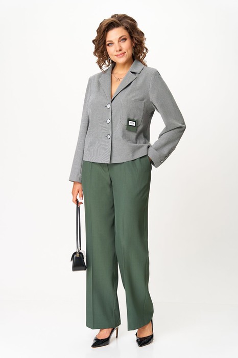 Комплект женский состоит из жакета и брюк. Элегантный женский жакет без подкладки с воротником пиджачного типа и застежкой на 3-и петли и пуговицы. По левой части переда накладной карман с декоративной нашивкой. Рукав втачной двухшовный со шлицей по низу и  пуговицами. Брюки прямого силуэта с заутюженными стрелками и притачным поясом. Для максимально комфортной посадки по бокам пояса вставлена эластичная резинка. Застёжка на молнию с гульфиком и пуговица по поясу. По переду в боковых швах карманы. Задние половинки брюк с талевыми вытачками.