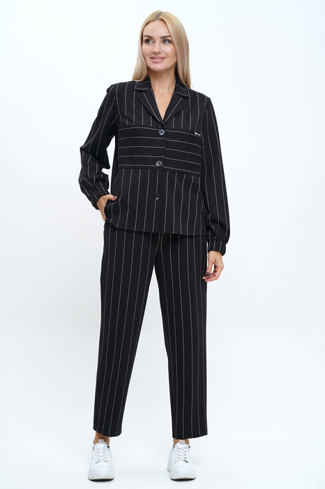 Жакет полуприлегающего силуэта, с застёжкой на петли, пуговицы. Перед с отложными лацканами. Спинка с талевыми выточками.Рукава втачные, одношовные, длинные. Воротник отложной. Декорирован нашивками по центру спинки и левой стороне переда.