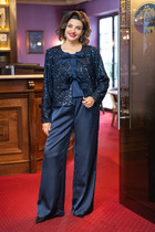 Жакет прямого силуэта, со спущенной линией плеча, с застёжкой по притачной планке на пробивные петли и пуговицы. Перед с накладными карманами с клапаном, клапаны декорированы пришивными нашивками. Спинка со средним швом, чуть ниже линии талии кулиса и завязка фиксируемая степень прилегания. Рукава втачные, двухшовные, понизу с разрезом, мягкой складкой и притачными манжетами на пробивную петлю и пуговицу. Воротник отложной.