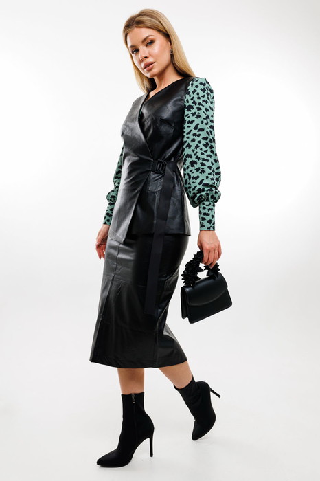 Юбка-карандаш прилегающего силуэта выполнена из мягкой эко-кожи. По переду горизонтальные и вертикальные подрезы. Задняя часть юбки со средним швом. В среднем шве застежка на потайную тесьму молнию. По низу разрез.