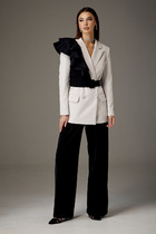 Брюки прямого кроя с высокой посадкой на притачном поясе, застежка на тесьму-молнию гарантирует удобство при носке. Удобные боковые карманы повышают функциональность изделия. Модель выполнена из качественного тканевого материала, который хорошо держит форму и подходит для деловых встреч, официальных мероприятий или повседневной носки в офисе. Этот костюм — прекрасный выбор для женщин, ценящих в одежде универсальность и изысканность.