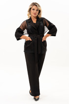 Жакет на запах приталенного силуэта с V- образным вырезом. По переду заложены складки.Застежка в виде пояса. Полочки ассиметричные по низу с заостренными углами. Перед жакета на подкладке.