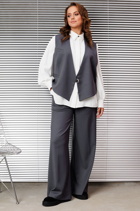 Женский брючный костюм тройка, состоящий из жилета, брюк и рубашки. Изысканный жилет полуприлегающего силуэта, он полностью на подкладке, что обеспечивает идеальную посадку и комфорт, дополнен застежкой на декоративную тесьму и потайную пуговицу. На правой полочке обработан нагрудный карман листочка и функциональный карман листочка в области талии, по горловине прилегающий воротник стойка. Спинка со средним швом и выточками. Брюки свободного прямого кроя со средней посадкой. В боковых швах функциональные карманы с отрезным бочком. Верхний срез оформлен поясом с эластичной тесьмой. Блузка прямого силуэта идеально сочетает в себе комфорт и стиль. В блузке классический рубашечный воротник и удобная центральная застежка на потайной планке на петли и пуговицы. Рукава втачные со сборкой по низу что обеспечивает эффектный объемный вид, по низу обработан притачной манжет застегивающийся на петлю и пуговицу. По полочке в области груди подрез. По спинке кокетка, переходящая на полочку и бантовая складка от кокетки. В боковых швах по низу обработаны разрезы