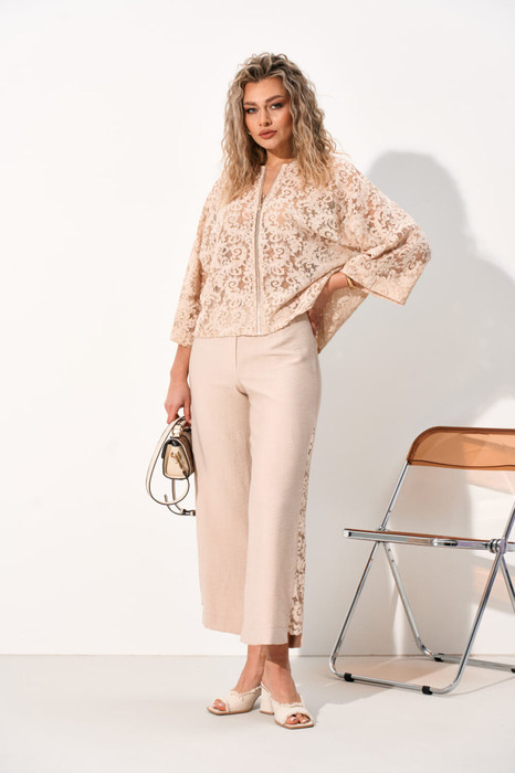 Костюм женский состоящий из бомбера и брюк.  Брюки прямого силуэта выполнены из смесового волокна льна и вискозы благодаря чему отлично садятся по фигуре и обеспечивают износостойкость с отделкой в боковом шве из гипюра. В среднем шве обработана застежка на тесьму-молнию, верхний срез обработан притачным поясом с шлёвками для ремня, по спинке вставлена резинка что обеспечивает идеальную посадку на любую талию.