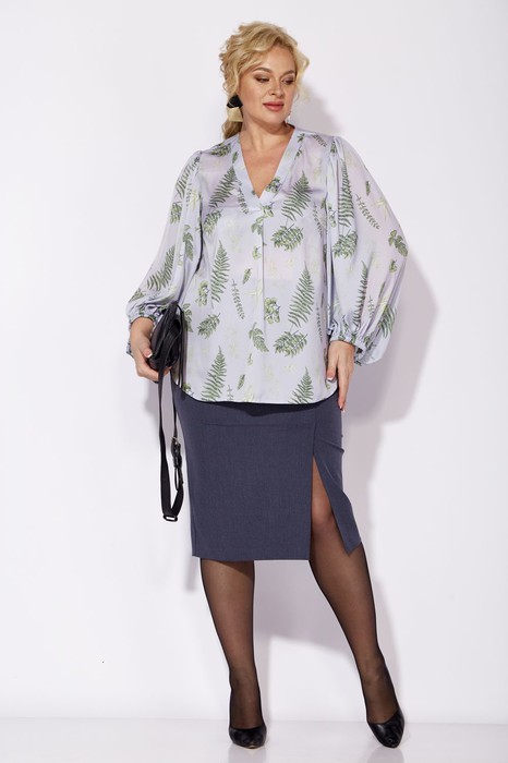 Комплект женский 2-предметный (блузка и юбка). Блуза из шифоновой ткани, полуприлегающего силуэта. По полочке идет нагрудная вытачка из бокового шва. Вырез V-образной формы с планками и складкой по центру. По спинке средний шов, рукав объемный, по окату сборка. Низ рукава фигурный, на резинке. Юбка  зауженная к низу, по полочке по линии колена - шлица. По спинке: средний шов, молния, пояс отрезной с резинкой.  Длина спинки (блузки): -71 см.  Длина рукава: -58 см. Длина юбки -75см