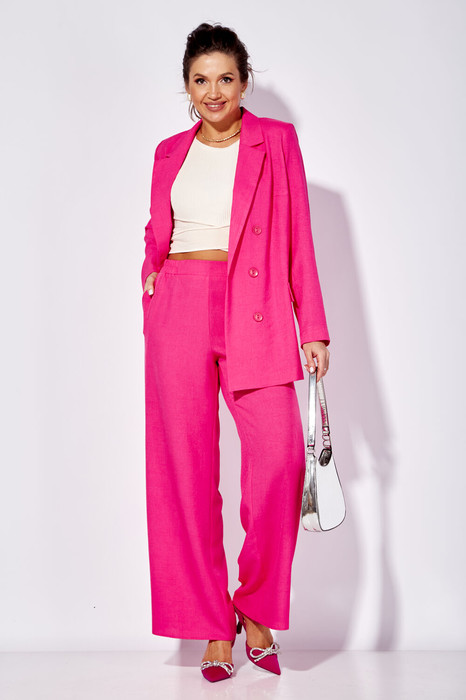 Костюм женский 2-х предметный: жакет и брюки. Жакет полуприлегающего силуэта: бочок с выточкой по полочке, по спинке средний шов. Застежка двубортная, карман клапан "обманка". Рукав двухшовный. Брюки прямые. По полочке карман и складки. Пояс на резинке. Длина жакета: 73 см. Длина рукава: 62 см. Длина брюк: 100 см