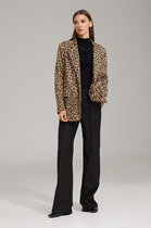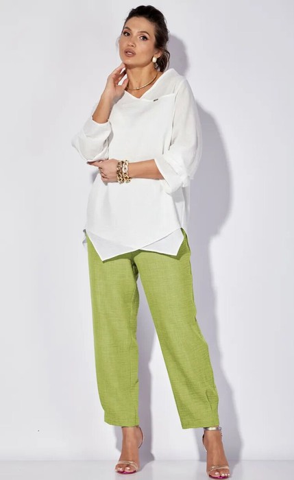 Комплект женский 2-хпредметный (блузка и брюки). Блузка женская из текстильной ткани. Модель прямого силуэта, рукав углублённый , рубашечного типа. Перед идет с запахом, низ блузы ассиметричный, по полочке углы, спинка закруглённая, удлинённая. По рукаву идут защипы.В качестве декора-логотип фирмы на горловине. Брюки из текстильной ткани, прямые, зауженные к низу за счет защипов. Пояс на резинке, по бокам карманы. Длина по спинке: 80см. Длина рукава: 47см. Длина брюк (48-52) -93см, (54-58)-95см