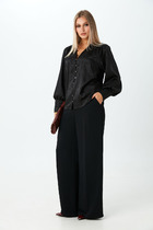 Комплект женский 2-х предметный (блузка, брюки). Костюм отлично подойдет как для повседневной носки (работа, офис, прогулки), так и для праздничных выходов. Достаточно дополнить его соответствующими аксессуарами. Предметы комплекта легко будут сочетаться с вещами из Вашего гардероба.   Блузка из трикотажного полотна. Модель прямого силуэта, рукав углублённый, рубашечного типа. Перед  с запахом, низ блузы ассиметричный, по полочке углы, спинка закруглённая, удлинённая. По рукаву идут защипы. Брюки из текстильной ткани, прямые, пояс на резинке, по бокам карманы. На горловине блузки  пришит логотип фирмы. Длина блузки (по спинке): (46-58) - 78 см. Длина рукава: (46-58) - 45 см. Длина брюк: (46-58) - 101 см