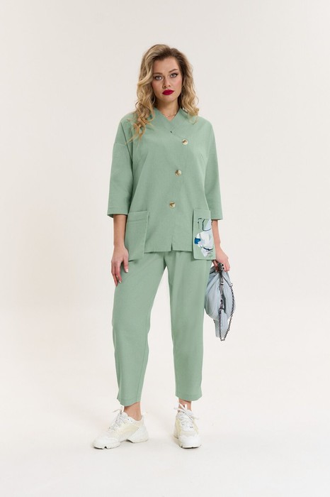 Женский брючный костюм — это идеальное сочетание стиля, комфорта и универсальности, которое станет вашим верным спутником как на деловых встречах, так и при повседневной носке. Изготовленный из высококачественной ткани, этот костюм обеспечивает легкость и приятные ощущения при носке. Костюм женский 2-хпредметный (жакет и брюки).  Жакет из текстильной ткани прямого силуэта со спущенным плечом. По полочке идут грудовые выточки из бокового шва. Застежка ассиметричная. Воротник стойка. По спинке встречная складка. Рукав 3/4. По полочке идут отлетные накладные карманы с декором (термонаклейка). Брюки прямые, зауженные к низу за счет защипов. Пояс на резинке, по бокам карманы. Длина спинке:(48-52)-70см, (54-58)- 73см. Длина рукава:(48-58)-33см.  Длина брюк (48-50) -93см, (52-58)-95см