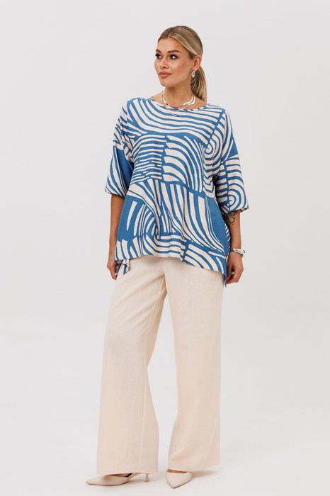 Комплект женский 2-х предметный (блузка, брюки) из текстильной ткани двух видов станет отличным дополнением к вашему гардеробу. Подойдет как для повседневной носки (работа, офис, прогулки), так и для праздничных выходов. Достаточно дополнить его соответствующими аксессуарами. Предметы комплекта легко будут сочетаться с вещами из Вашего гардероба. Блузка со спущенным плечом, трапециевидного силуэта с разрезами по бокам. Брюки прямые однотонные, пояс на резинке, по бокам карманы. Длина по спинке (50-54) - 66 см, (56-60) - 70 см. Длина рукава: (50-60) - 22 см. Длина брюк: (50-54) - 103 см, (56-60) - 106 см