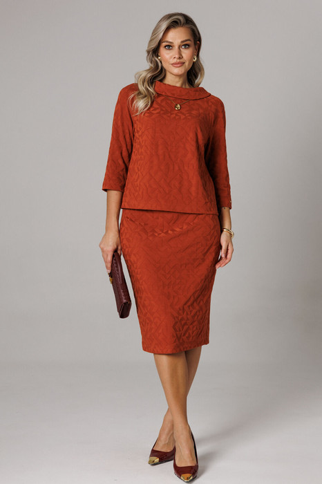 Женский костюм двойка из вязанного полотна с объемным рисунком станет изюминкой вашего гардероба. Этот деловой комплект с блузкой плюс сайз станет отличным выбором для офисных работников и всех, кто ценит комфорт и стиль в одежде. Юбка без подкладки обеспечивает свободу движения, а длина (миди) делает ее универсальной для любого типа фигуры. Блузка без застежки с воротником шалевой формы - это не только функциональный, но и стильный женственный акцент в образе. Длина рукава в блузке plus size 3/4 делает костюм универсальным.   Этот теплый классический  костюм  создан для повседневной носки и будет радовать вас своей мягкостью и комфортом даже в самые холодные дни. Комплект шикарный и создан с учетом особенностей женской фигуры и идеально подойдет для обладательниц пышных форм, для высоких и невысоких. Он одинаково хорошо смотрится на стройных и плюс сайз, с большой и маленькой грудью. Благодаря своему строгому и элегантному дизайну, юбочный костюм станет незаменимым элементом вашего гардероба и поможет создать множество деловых и вечерних образов. Почувствуйте себя уверенно и комфортно с стильным костюмом от "Анастасия"! Комплект без подклада, не на флисе, без начеса, ткань не просвечивает.  Длина блузки-53см. Длина рукава (от горловины) - 55см. Длина юбки-72см.