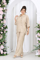 Представляем вашему вниманию стильный  комплект, который станет настоящим маст-хэвом в вашем гардеробе. Этот комплект станет вашим верным спутником в любой ситуации, добавляя нотки элегантности и шарма в вашу повседневную жизнь. Комплект женский 2-х предметный (блузка, юбка). Блузка прямого силуэта,  из трикотажного полотна двухнитка, со спущенным плечом станет незаменимой вещью в вашем гардеробе. Рукав "летучая мышь", 3/4 длины. Горловина цельнокроенная в виде стойки. В качестве декора -брендированная металлическая нашивка по низу блузки.  Юбка расширенная к низу.  Пояс на резинке. Для повседневного ношения отлично подойдёт будущим мамам и беременным.  Мягкая резинка в поясе не давит и идеально держится на любой талии.    Отдельные части крмлекта будут легко сочитаться с вещеми из вашего гардероба. ВНИМАНИЕ! Колье не входит в комплект.  Длина блузки(по спинке): (50-60)-60 см. Длина рукава от головины: (50-60) -56см. Длина юбки - 85см.
