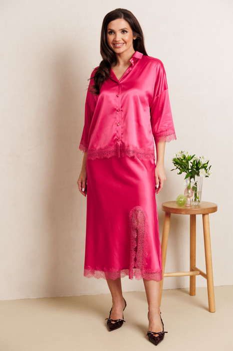 Женский элегантный костюм от Anastasia, подходящий для нарядной и повседневной носки. Костюм женский 2-х предметный из атласной ткани с отделкой из деликатного кружева (блузка, юбка). Ажурное кружево, деликатно украшающее низ костюма, добавляет образу романтичности и утонченности. Отлично подойдет на любой тип фигуры, подчеркнет вашу женственность. Блузка прямого силуэта со спущенным плечом. Застежка- планка на петли и пуговицы. Воротник на отрезной стойке. Рукав одношовный, втачной, 3/4 длины. Юбка косая с разрезом по колену длины миди выполнена из мягкого атласа, который приятно струится по фигуре, создавая женственный и изысканный силуэт. Пояс на резинке. Юбка с кружевом внизу станет идеальным выбором для создания как повседневных, так и праздничных образов. Длина блузки с крудевом (50-54)- 59см, (56-60)- 62см . Длина рукава с кружевом (50-60)- 29см. Длина юбки с кружевом (50-60)- 90 см.