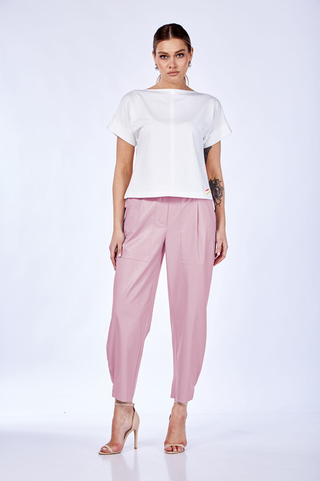 Комплект женский 2-х предметный (топ и брюки). Топ прямого силуэта из трикотажного полотна со спущенным плечом, по бокам разрезы, спинка длиннее чем полочка. По центру полочки и спинки - отделачная строчка. Рукав в виде манжены, вырез горловины в форме лодочки. В качестве отделки по низу полочки - нашивка. Брюки бананы из Эко-кожи. Укороченные, сужающиеся к низу за счет встречной складки. По переду идут подрезные карманы и складка по линии талии. Застежка на молнию.  Пояс отрезной с резинкой.Благодаря своему крою и фасону костюм подчеркивает женственные формы и скрывает то, что должно быть незаметным.  Это повседневный вариант на каждый день для занятий в школе или для офиса, на работу или на прогулку, а также на празничные выходы.  Достаточно добавить соответствующие аксессуара и обувь.  Топ и брюки можно легко совмещать с другими предметами вашего гардроба.  Длина спинки(46-50)-55 см, (52-54)-58см.  Длина рукава (манжета): (46-54)-4 см. Длина брюк: (46-50)-94см, (52-54)-96см.