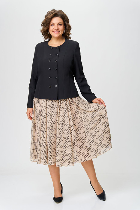 Костюм состоит из жакета и юбки. Жакет полуприлегающего силуэта выполнен из однотонной ткани, жакет на подкладке.