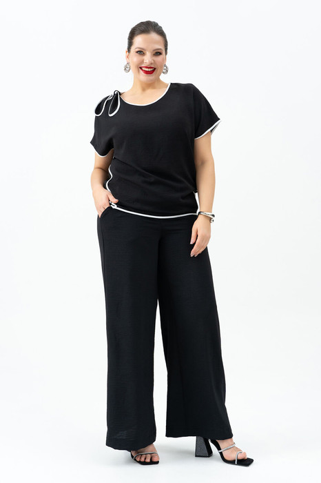 Костюм женский брючный. блузка прямого силуэта, с асимметричными спущенными плечами, с контрастной окантовкой. Брюки женские повседневные свободного кроя , на притачном поясе со шлевками по переду и поясом завязкой, пояс по спинке с резинкой, Передние половинки с боковыми наклонными карманами. Задние половинки с талевыми вытачками.