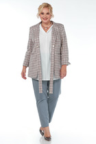Прямой двухбортный жакет, брюки на резинке по спинке и с карманами.