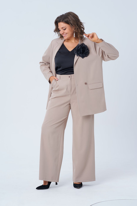 Прямой двухбортный жакет, брюки на резинке по спинке и с карманами.