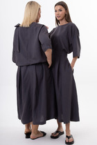 Крой рукава блузы - летучая мышь, низ рукава оформлен складочками. Распашная спинка закреплена игривыми завязками на люверсах.