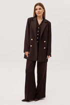 Этот элегантный костюм, состоящий из жилета и брюк, воплощает в себе утонченность и уверенность. Полуприлегающий силуэт жилета мягко подчеркивает линии фигуры, создавая гармоничный баланс между строгостью и женственностью. Однобортная застёжка на петли и пуговицы придает образу аккуратность и завершенность, а отложные лацканы воротника добавляют ноту классической сдержанности.
