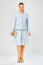Жакет однобортный полуприталенного силуэта, без подкладки. Воротник пиджачного типа с отложными лацканами. По переду центральная застежка на петли и пуговицы, накладные карманы и рельефы. Низ бортов закругленной формы. Спинка со средним швом. Рукав втачной двухшовный длинный.