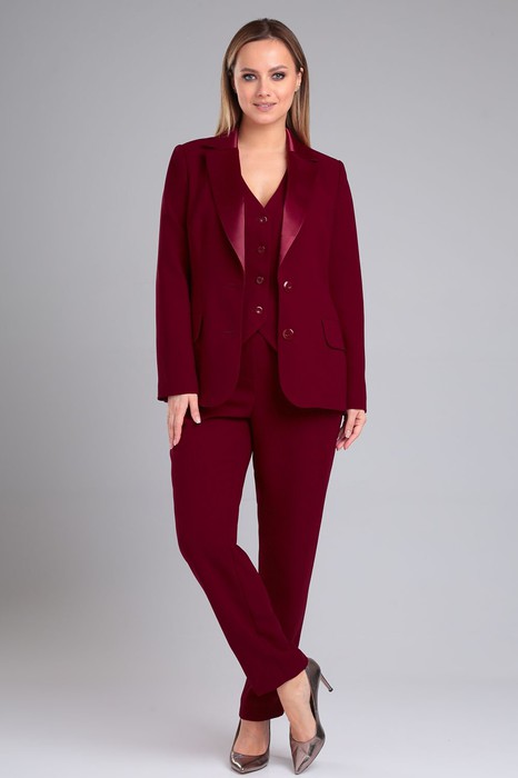 Жакет однобортный полуприталенного силуэта, на подкладке, с плечевыми накладками. Воротник пиджачного типа с отложными лацканами. По переду центральная застежка на петли и пуговицы и прорезные карманы с клапаном, талиевые вытачки и рельефы. Низ бортов закругленной формы. Спинка со средним швом и рельефами. Рукав втачной двухшовный длинный. Жилет прилегающего силуэта с центральной бортовой застежкой на петли и пуговицы, на подкладке. Вырез горловины V-образной формы. Перед - с талиевыми вытачками и прорезными карманами с листочкой. Спинка со средним швом и талиевыми вытачками. Брюки с высокой посадкой, слегка заужены книзу. Притачной пояс со шлевками и застежкой на молнию и пуговицу, по боковым - вставка из эластичной тесьмы. На задних половинках - вытачки. В боковых швах расположены функциональные косые карманы.