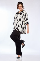 Комплект состоит из рубашки и брюк выполнен из трикотажного полотна с абстрактным геометрическим принтом.Характеристики: рубашка прямого свободного кроя, воротник классический - отложной, застежка центральная на петли пуговички, по переду крупные карманы, рукав спущен, в боковых швах разрезы. Длина рубашки по спинке 72 , длина рукава 74 см от края горловины. Брюки прямого кроя, пояс на резинке, в боковых швах карманы. Длина брюк 98 см.
