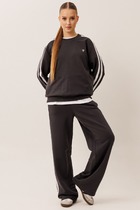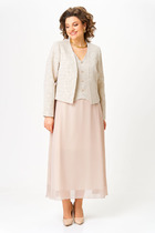 Комплект состоит из джепера и брюк выполнен из полупрозрачного полотна розового цвета. Характеристики: джемпер прямого свободного кроя, овальный широкий вырез горловины, рукав спущен. Длина по спинке от края горловины 72 см, длина рукава от края горловины 75 см. Брюки прямого, свободного кроя, пояс брюк на резинке. Длина брюк по боковой линии - 110 см.