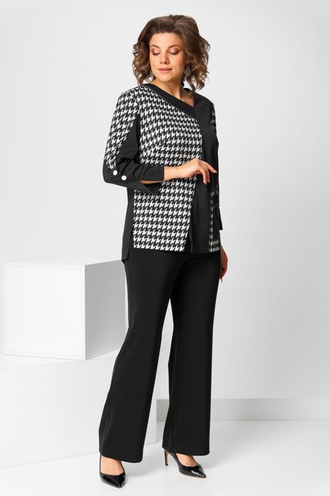 Костюм брючный (двойка) женский полуприлегающего силуэта, состоит из джемпера и брюк. Костюм выполнен и трикотажного полотна и брючной ткани. Джемпер без застежки, рукав длинный с фигурной вставкой. По низу разрез. Горловина фигурная V-образная со вставкой, декорированной тесьмой с имитацией "молнии". Перед с асимметричным подрезом в области бедра вставка с карманом с отделочной тесьмой. По переду внизу разрез  по рельефу. По боковым швам внизу разрезы. Спинка свободная.  Брюки классические, со стрелками на поясе с резинкой. Застежка на гульфик, на тесьму-молнию. Вверху косые карманы.