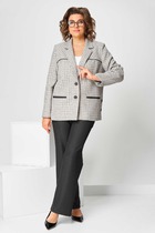 Комплект брючный женский полуприлегающего силуэта состоит из жакета и брюк. Жакет выполнен из полушерстяной ткани в клетку. Жакет  на подкладке, с бортом и двухшовными рукавами.  Перед с центральной застежкой на пуговицы. По переду выполнены кокетки с кантом и прорезные карманы в рамку. В боковых швах шлицы и застежка на пуговицы. Спинка со средним швом и выточками. Брюки из костюмной ткани, с карманами в боковых швах; оформлены притачным поясом, частично на резинке. Застежка на гульфик, на тесьму-молнию.