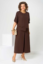 Костюм женский свободного силуэта, выполнен из костюмной ткани. Блузка с рукавами 7/8. Перед с ассиметричной кокеткой и рельефом, ниже уровня талии фигурный   клапан. Спинка свободная. Низ блузки фигурный разноуровневый. Юбка-брюки на кокетке, с накладными карманами. Застежка на тесьму-молнию  в боковом шве.