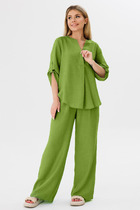 Костюм 2-предметный: жакет и брюки. Двубортный жакет на подкладке, прямого силуэта. Обработаны прорезные карманы по переду. Рукава втачные одношовные, обработаны шлицей.  Брюки прямого кроя, длинна 7/8, застёжка- гульфик , по юоковым вам обработаны карманы