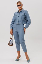 Костюм 2-предметный: жакет и брюки. Жакет однобортный прямого силуэта, на подкладке. По переду обработаны накладные карманы, а также пррорезной карман. Жакет выполнен из плотного денима, а ткаже их костюмной ткани. Брюки прямого силуэта, выполнены из плотного денима, с разрезами по переду. Застёжка - гульфик