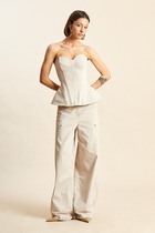 Костюм 2-хпредметный. Жакет приталенного силуэта, обработан подкладкой. Отрезной по линии талии, декорирован пришитым поясом по линии талии. Низ изделия обработан баской, собранной в складку. Рукав длинный, вачной. Окат рукава обработан вставкой для удлиннения плечевого шва. Перед жакета обработан сборкой. Брюки прямого кроя, длинна 7/8, застёжка- гульфик , по боковым швам обработаны карманы