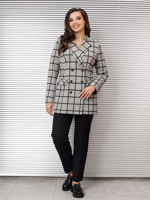 Комплект женский брючный, состоящий из жакета и брюк. Жакет из тёплой костюмной ткани с бархатистым ворсом, "в клетку", 2-бортный с застёжкой спереди на пуговицы, с отложным воротником, по переду карманы с клапанами,полуприлегающий, удлинённый, Изделие на подкладке.  Брюки на поясе- кокетке с эластичной тесьмой по задней части пояса, с имитацией застёжки, зауженные к низу с разрезиками в боковых швах.