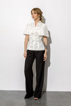 Комплект женский, состоящий из жакета и брюк. Жакет прилегающего силуэта с вертикальными рельефами от проймы по переду и спинке, с отложным воротником, с застёжкой спереди на петли и пуговицы, рукав вточной 2-х шовный со шлицей, по переду карманы с клапаном. Изделие на подкладке. Брюки прямые, зауженные к низу, на поясе-кокетке с застёжкой спереди на молнию и пуговицу, с боковыми карманами, со стрелками и шлёвками.