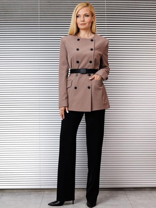 Комплект женский брючный, состоящий из жакета и брюк. Жакет на подкладке полуприлегающего силуэта, с втачным рукавом, без воротника,горловина полукруглая,застёжка спереди 2-бортная,по переду карманы с клапанами, под съёмный пояс. Брюки узкие, к низу свободные, длинные, на поясе-кокетке,с боковыми карманами,с застёжкой на молнию и пуговицы.