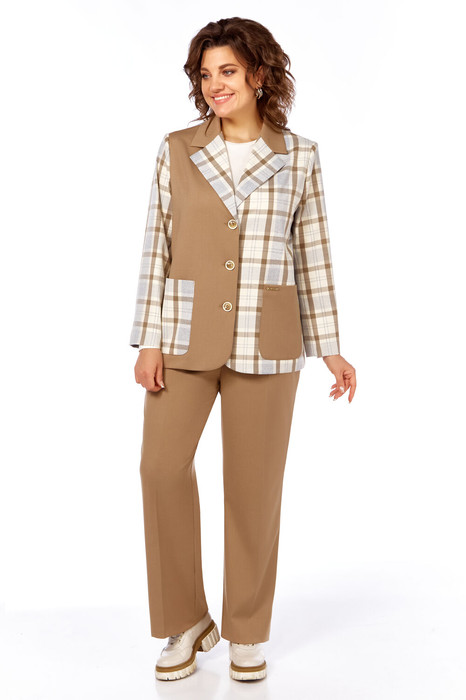 Женский двухпредметный костюм состоит из жакета,выполненного в комбинации плательно-костюмной ткани в клетку и однотонной,и брюк ,выполненных из однотонной плательно-костюмной ткани.