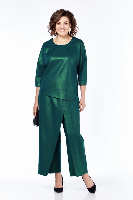 Женский нарядный двухпредметный костюм состоит из блузы и брюк с имитацией юбки спереди,выполнен из плательно-костюмной однотонной ткани с блестящим напылением.