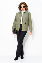 Блуза прямого силуэта, "оверсайз", с цельнокроеным рукавом длиной 3/4, заканчивающимся притачной манжетой, выполнена из двух видов ткани. Перед с притачной горизонтальной планкой по низу, разрезами в боковых швах и втачной планкой по горловине, застёгивающейся на 2 кнопки. Воротник - стойка. Спинка удлиненная,с отрезной кокеткой из сетки, нижняя часть спинки с центральной застёжкой на 4 кнопки.Низ спинки фигурный.