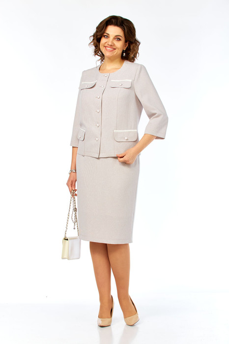 Женский двухпредметный костюм состоит из жакета и юбки ,выполнен в стиле "Шанель" из плательно-костюмной ткани в мелкий рисунок "гусиная лапка".