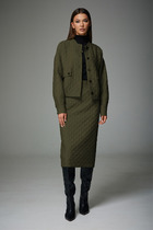 В комплекте юбка-карандаш зауженная к низу, длиной за колено. Модель с пикантным разрезом по переду и карманами с отрезным бочком. Застежка на металлическую молнию с обработанным гульфиком. Пояс притачной, в боковых участках вставлена резинка,со шлевками. Спинка со средним швом,кокеткой и накладными карманами.
