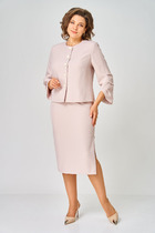 Изысканный костюм состоит из 2-ух предметов: блузки и брюк. Выполнен из костюмно-смесового полотна. У этой ткани нежная, гладко-бархатистая фактура, приятная на ощупь и матовая поверхность. Она легко драпируется и очень выгодно и дорого подчёркивает образ.