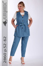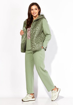 Комплект 2-х предметный состоит из жакета и брюк. Жакет женский удлиненный, полуприлегающего силуэта с центральной бортовой застежкой на пуговицы до линии перегиба лацкана. Спереди рельефные швы от плечевого шва, отрезной бочок и карман с клапаном. Спинка с рельефами от плечевого шва. Рукав втачной, двухшовный. Воротник пиджачного типа. Жакет на подкладке. Длина рукава 61,5 см, длина по спинке 70 см. Классические брюки, прямые, слегка заужены к низу, по переду обработаны карманы с отрезным бочком, застежка на тесьму-молнию и 1 пуговицу. На задних половинках обработаны вытачки и имитация карманов в рамку с двумя обтачками, пояс в брюках притачной. По низу брюк в боковом шве есть небольшой разрез. Длина брюк от талии по боковому шву 97 см