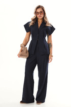 Комплект женский-двойка, из текстильной ткани, жакет женский удлиненный, из трикотажной ткани, перед жакета на подкладке, полуприлегающего силуэта с центральной бортовой застежкой на пуговицы до линии перегиба лацкана. Спереди рельефные швы от плечевого шва, отрезной бочок и карман с клапаном. Спинка с рельефами от плечевого шва. Рукав втачной, двухшовный. Воротник пиджачного типа. Длина по спинке 70, длина рукава 61. Брюки-палаццо,средней ширины,из плотной текстильной ткани, выполнены с карманами с отрезным бочком в боковом шве. Пояс притачной, застёжка на молнию. По задним половинкам обработаны вытачки. Длина по боковому шву 108 см.