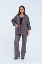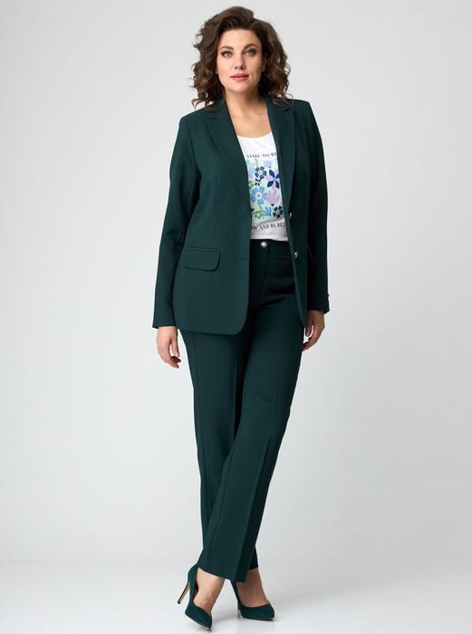 Комплект женский, 2-х предметный, состоит из жакета и и брюк. Жакет женский удлиненный, из текстильной ткани, на подкладке, полуприлегающего силуэта с центральной бортовой застежкой на пуговицы до линии перегиба лацкана. Спереди рельефные швы от плечевого шва, отрезной бочок и карман с клапаном. Спинка с рельефами от плечевого шва. Рукав втачной, двухшовный, по низу рукава обработана шлица на петли-пуговицы. Воротник пиджачного типа. Длина по спинке 66 см, длина рукава 62 см.Брюки прямые,классические, с заутюженными стрелками,по переду обработаны карманы с отрезным бочком,застежка на тесьму-молнию и 1 пуговицу.На задних половинках обработаны вытачки и имитация карманов с листочкой, пояс в брюках притачной. Длина брюк от талии по боковому шву 100 см.